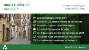 La delegada de Turismo, Regla Moreno, ha mostrado su satisfacción por la puesta en marcha del bono turístico elaborado por la Junta de Andalucía. Esta iniciativa, que se inicia el próximo 1 de octubre y que se extenderá hasta el 31 de mayo de 2021, pone a disposición de todos los ciudadanos andaluces que viajen una reducción de hasta el 25% en la factura. El descuento máximo sería de 300 euros, los interesados deben acreditar que han tenido una estancia de al menos 3 noches en su destino y durante esté vigente esta iniciativa se podrá utilizar este bono hasta en tres ocasiones.